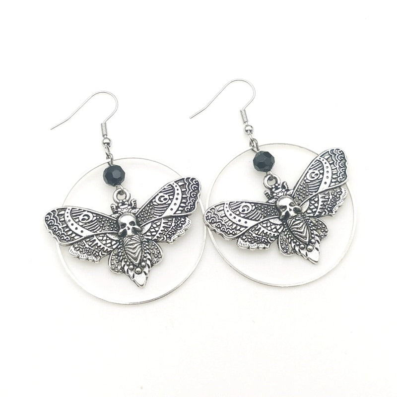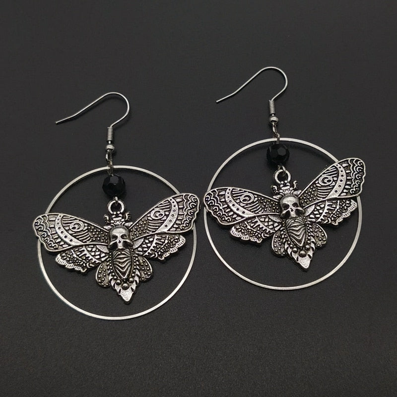 Diese Ohrringe sind von unheimlichen Nachtfaltern inspiriert und haben ein elegantes und mysteriöses Design mit kleinen Mond-Details. Sie sind aus einem robusten und widerstandsfähigen Material gefertigt. Perfekt für diejenigen, die nach einem originellen und kühnen Accessoire suchen, um ihr Outfit zu vervollständigen.