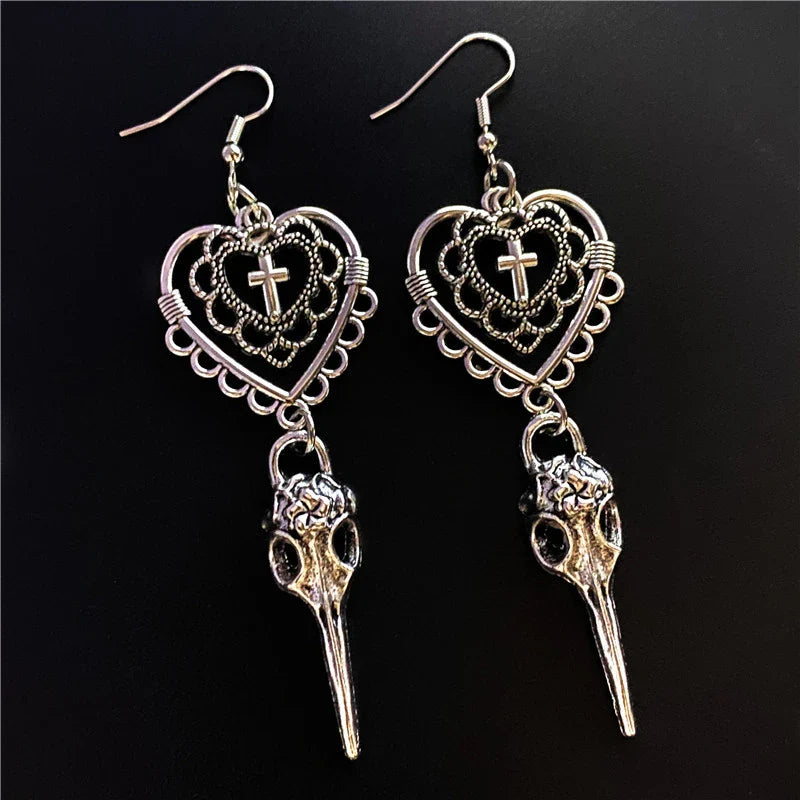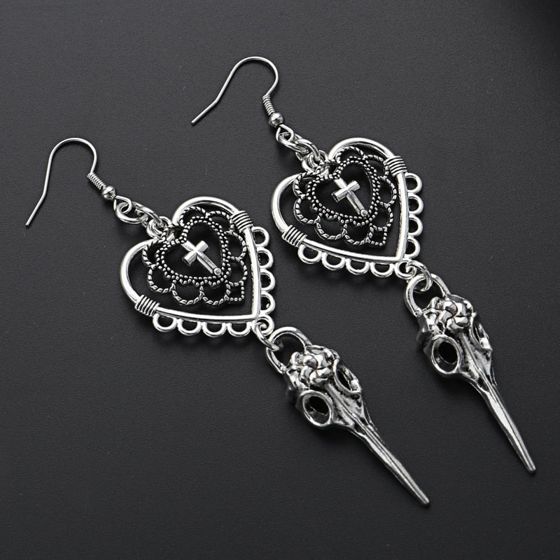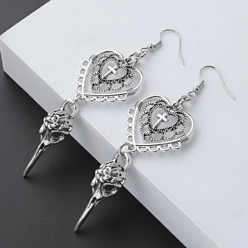 Die 'Vogel-Schädel mystisch' Ohrringe sind ein faszinierendes Paar Ohrringe mit einem innovativen und mysteriösen Design. Jeder Ohrring besteht aus einem sorgfältig gearbeiteten Vogelschädel aus Metall mit realistischen und komplizierten Details, die das Geheimnis und die Schönheit der Natur hervorrufen. Der Schädel ist mit einem Herz und einem Kreuz verziert, die dem Design eine symbolische und mysteriöse Note verleihen.